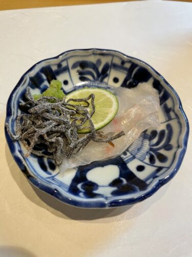 最初のお刺身は山口県産のアコウ!アコウって幻の魚って思っていたのですがここ最近はよく獲れるですかね~。塩昆布と一緒にいただくのでより甘みを感じます。
