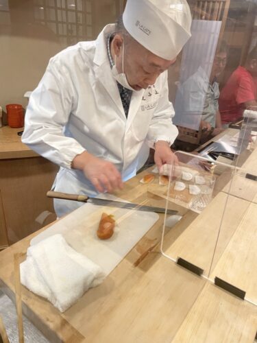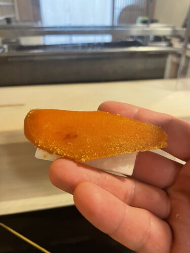 すると大将が何かを切り始めてくださいました。なんとからすみ!大根と一緒にいただきます。めちゃくちゃ美味しいんですよ、このからすみ!喜多丘さんは2つだけ自家製じゃないものがあります。そのうちの一つがからすみ!和歌山のおばあちゃんが手作りされているこのからすみには勝てないんだそうです。確かに美味しい~!