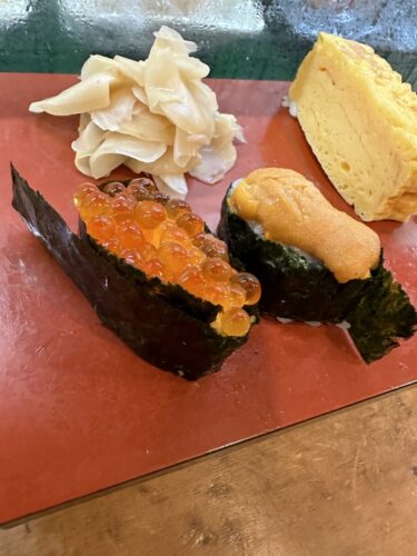 初めて伺ったのでとりあえずは寿司を一人前お願いしました!まずは玉子が登場!大きくておいしそう!最後に食べたいので少しおいておきます。