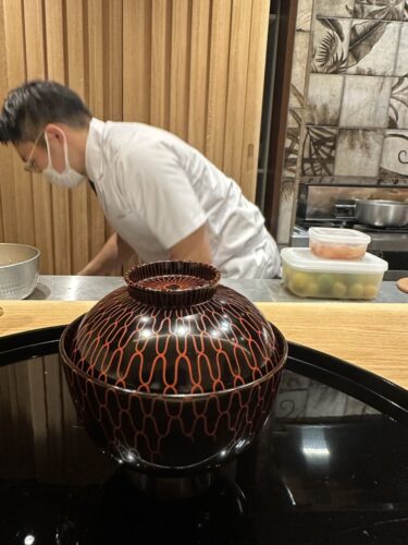 ここで八寸が登場しました!喜多丘さんでよくいただく赤こんにゃくも入っていました!ぶりの獺祭酒粕漬け、青梅、鮎の油煮、鱧の山椒煮などなど!どれもとっても手がかかっていてとっても美味しいじゃないですか~!いろいろと研鑽を積まれたんだな~と感慨深かったです。