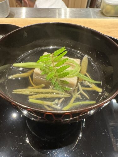 賀茂茄子豆腐にじゅんさい、みつばに木の芽のお汁でした!いいお出汁をひいていらっしゃいました。お豆腐も美味しいですね~!じゅんさいもたっぷり!