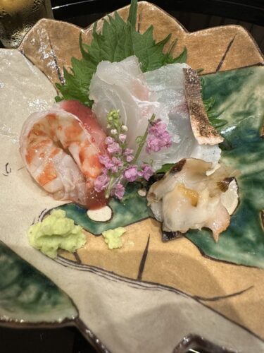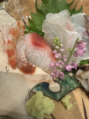 そしてお造りが登場しました。車海老、あこう、ほうぼう、さざえに、、、え~っとこの赤身がかったお魚はなんだろう?