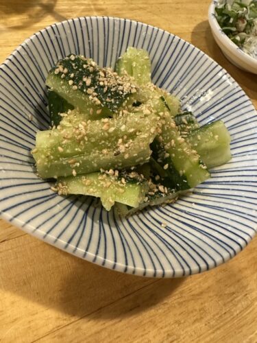 続いてたたききゅうりをお願いします。これもおすすめですね~!包丁で切っていないとどうしてこんなにも食感がかわるんだろうって不思議に思います。