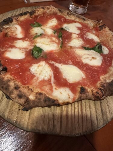 こちらのマルゲリータが登場しました!特注のピザ釜で焼いた最高のマルゲリータ!チーズもとろけておいしそうでしょう!もうめちゃうまです!