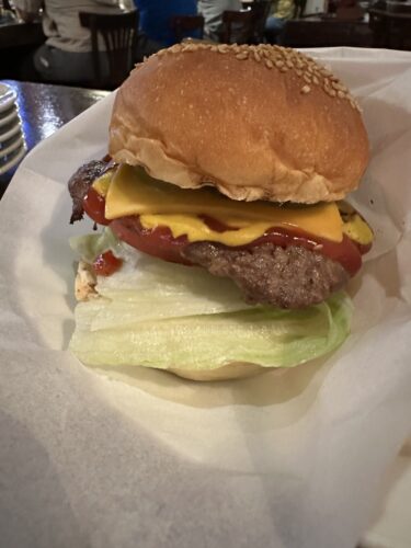 ハンバーガーをいただきましょう!私は定番のケンビーズバーガーをお願いしました!これ美味しいんですよ~!待っている間は無料で楽しむことができるビリヤードで楽しみました。