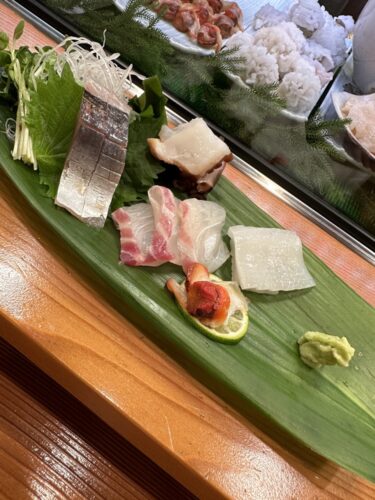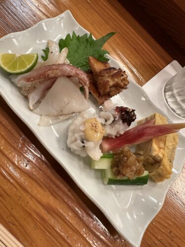 あまりこの盛り合わせを見たことがないです。私たちがよく食べるので作ってくださったのかな?玉子、アナゴ、イカゲソ、はも、きゅうりというラインナップ!最近いいアナゴが手に入らないって大将行っていましたがこの日は大きくて満足いくアナゴが手に入ったそうです。