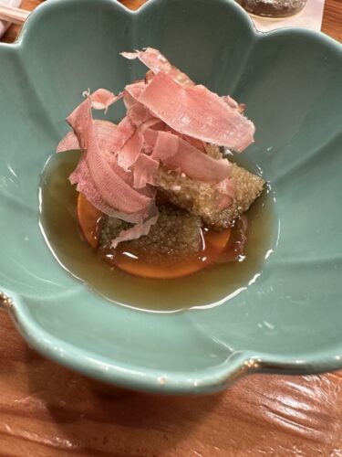 かつお節をシュッシュッと削る音がしてきます。いい音ですね~!そして子持ち昆布の上にたっぷりと!この子持ち昆布のぷちぷちっとした食感と削ったばかりのかつお節の香りがたまらないです!