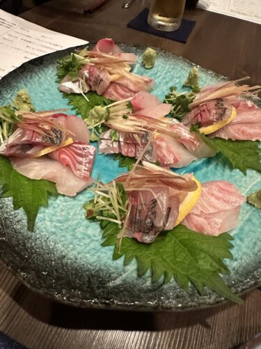 続いて我々だけお刺身を盛り合わせていただきました。天然鯛、天然アジ、いさきを盛り合わせていただきました。どれも最高に美味しい~!ミラさんは不思議そうに見ていらっしゃいました。(笑)