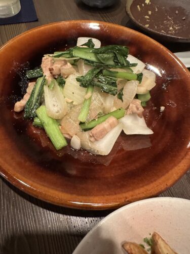 葉物とたまねぎのニンニク醤油炒めもいい香り~!ごはんと一緒に食べたらとまらないでしょうね~!