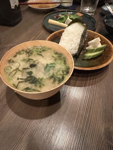 結人さんはおむすびも美味しいんですよ~!お漬物も最高ですし~!お味噌汁も抜群!