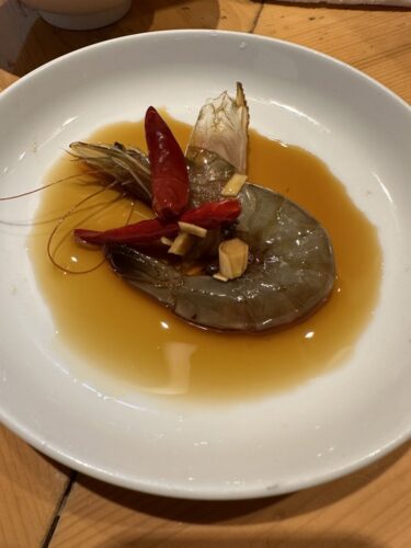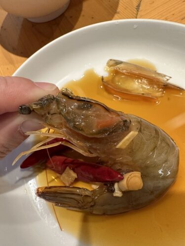 そして最初のお料理が海老の紹興酒漬け!これですよ、これ!これが食べたかったんです!殻を外していただきます。めちゃくちゃ美味しい~!この海老が本当に食べたくって!幸せです~!