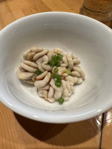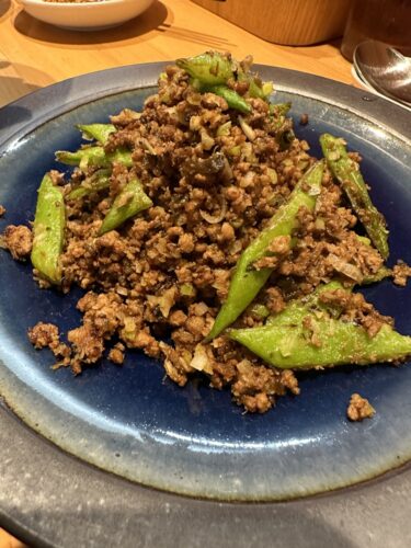インゲンとそぼろ炒めも定番ですね~!お酒がぐんぐんすすむ風味がたまらない~!一口食べて、ビール飲んで、また食べる。ほんと癖になる味ですね~!すごい!