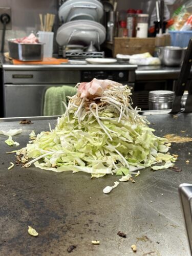 この日の肉玉そばイカ天でお願いしました!たっぷりの手切りキャベツをのせて蒸し焼きにしていきます。山のようなキャベツがじっくり蒸しあげていくとどんどん水分が抜けて行ってお好み焼きの形をあらわしてきます。