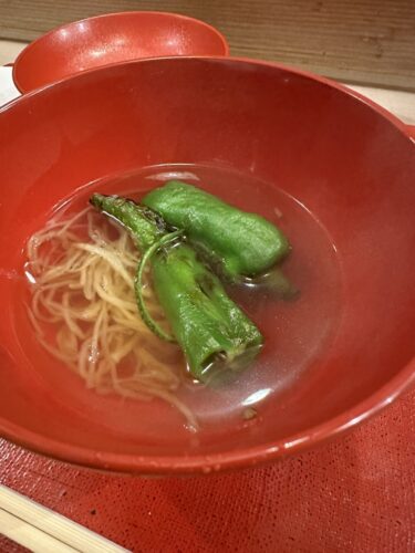 「鱧でとったお出汁とそうめん瓜、そして焼いた万願寺唐辛子です。」