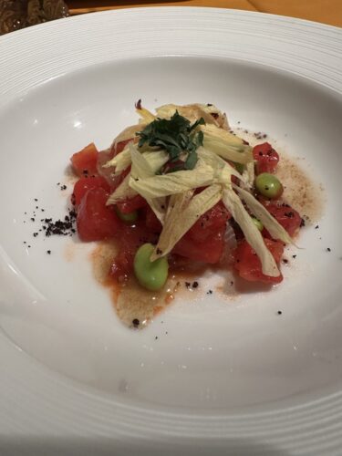 まずは瀬戸内の天然鯛のカルパッチョを!上にのっているのはなんとオクラの花なんだそうです。いただいてみると、鯛美味しい~!トマトとよくあっています!オクラの花は癖もなくて食べやすかったですよ~!これも経験だ~!