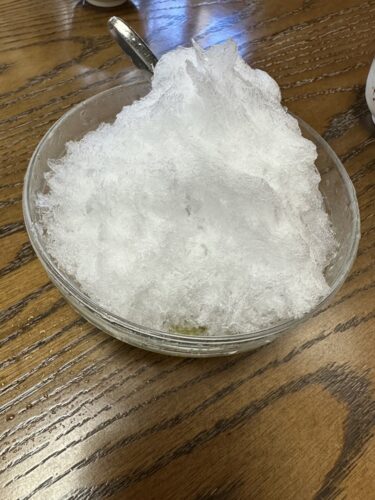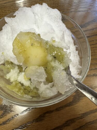 まずは氷を少し混ぜて氷の下にかくれているお餅とほどよい甘さの餡をすくっていただきます!甘さが氷で少し緩和されてめちゃくちゃ美味しい~!長い行列を暑さの中で待った甲斐がありました。氷で体もクールダウンできました~!