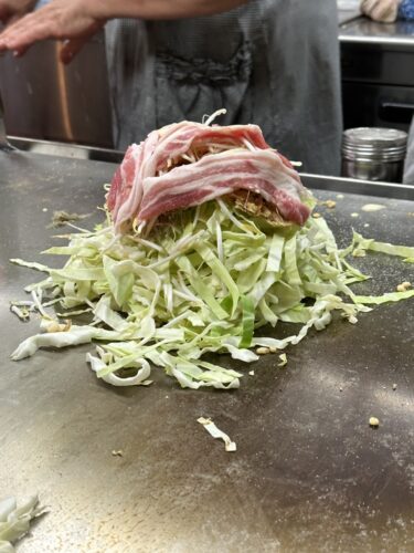 肉玉そばイカ天をお願いしました!たっぷりの豚肉をのせてくれます。ゆっくり蒸しあげていくタイプのお好み焼きですのでこんなにキャベツこんもり盛っていても気づいたらいつものお好み焼きのサイズになっちゃうんですよね~!