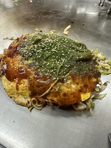 焼きあがったお好み焼きがじゅ~という音と一緒に目の前へ。めちゃくちゃ美味しそう!ヘラで切り分けていただくとめちゃくちゃ美味しい~!最高です!