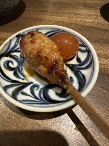 待ってました!鳥たんさんのつくね!このつくね最強です!まず一口いただいて、そのあとに濃い卵黄をつけていただきます!素晴らしい~!