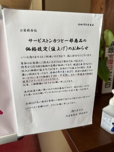 さて、ふとニュースを見ていると肉のますゐさんが来月から値上げされると!ますゐさんといえばサービスとんかつですよね!トンカツとごはんとポテサラとキャベツがついてきて380円なのですが、それが430円に値上げされると!(笑)