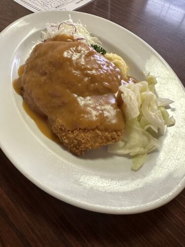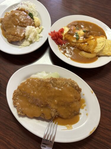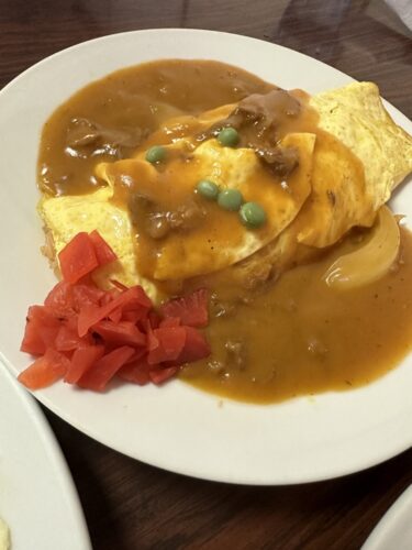 そしてハヤシオムライスが登場しました!ハヤシソースはトンカツソースとは少し色合いが違いますが似たような感じですね。いただいてみると、うま~~!特製のトンカツソースより少し酸味を感じるのでトマトか何かのソースが入っているのかな~。最高です!