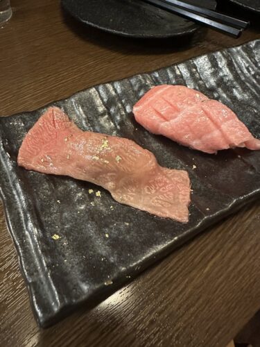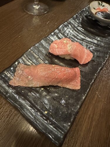 最後はやっぱり握りでしょう!お肉とマグロの握りをお願いしました。