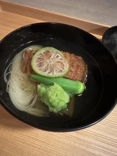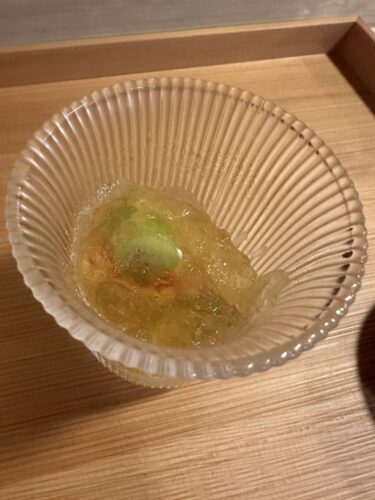 まずはそうめん瓜と蟹の爪と山口の白おくらのジュレ!夏らしいさっぱりといただけました!