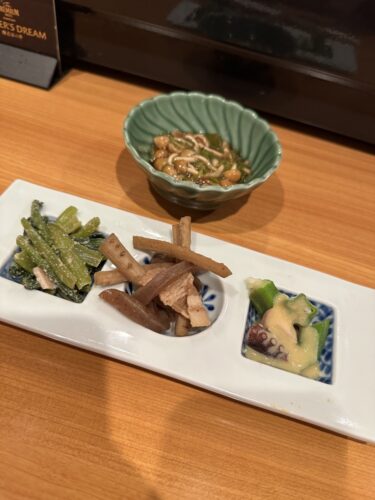 まずは先付をいただきながら考えます。ごぼうもとっても美味しい~、オクラも抜群ですね!大将の手作りのおつまみはいつもどれも素晴らしいです!