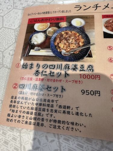 さて、先日たまたま行政の方とお話する機会がありまして指定していただいたお店でランチすることに。お店の名前はもんごい麻婆飯店さんです。もんごいってなんだか聞いたことあるような、麻婆豆腐専門のお店なんですって!