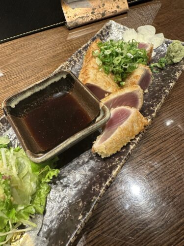 さて、先日の鉄板焼しんごさんの続きです。続いて登場したのがカツオのパン粉焼き!もちろんお刺身で提供するやつをパン粉焼きに!めっちゃめちゃ美味しい~!パン粉の食感がいいですね~!