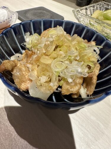 続いて鶏皮ポン酢をいただきます。カリッとしながらも弾力あって美味しいですね!