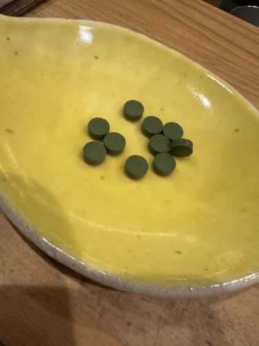 色的にはクロレラの緑が強いようです。10粒を一度にいただきます。これで安心!確かに次の日楽だったようなきがしますよ!