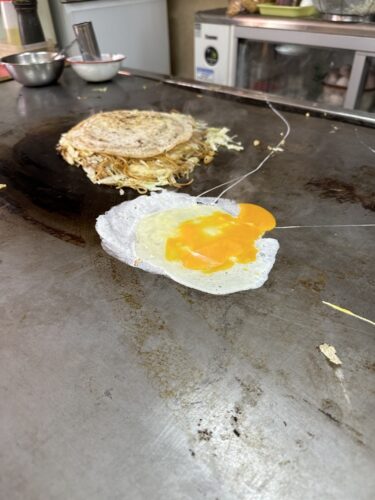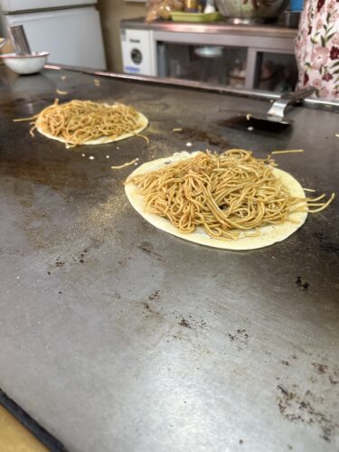鉄板の上で生地を焼いた後にそのすぐ上にそばをのせるタイプです。昔ながらのお店はこの焼き方が残っているところがありますね。