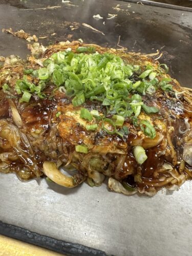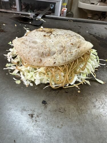 ちづるさんは昔ながらのお好み焼きがいただけるお店で美味しんです!メニューの中から肉玉そばの野菜ダブルにイカ天をトッピングしてもらいました!