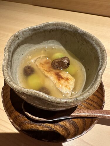 続いて白甘鯛と銀杏とむかごです。なかなかお目にかかれない白甘鯛をいただいてみると抜群!皮も美味しい~!久々にむかごをいただきましたがいいですね~!旬ですもんね~!