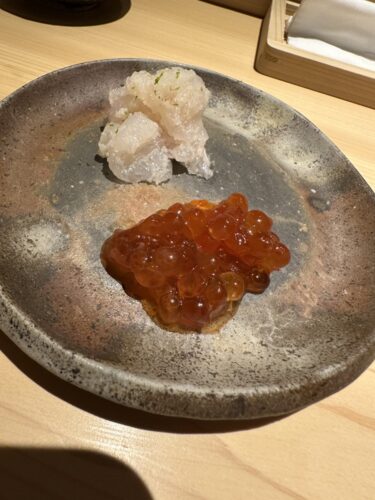 そして一緒にいただくのが、鱧の昆布〆と鱧の卵の塩漬けを合わせたもの!これが最高!鱧の子って食べたことないようなあるような。鱧自体もとっても美味しいし、卵の塩漬けとほんとよくあいました。