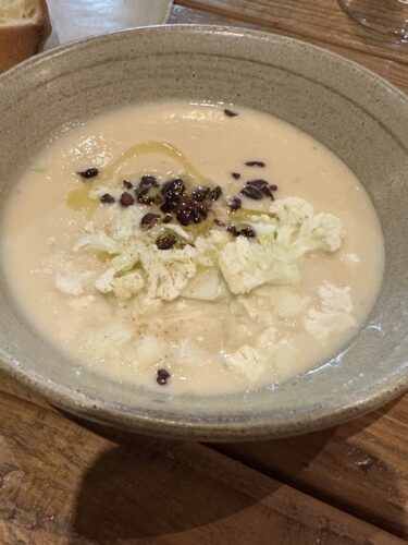 最初のお料理はカリフラワーのポタージュ!上にはアマゾンカカオがのっています。いただいてみるとこれがめっちゃ美味しい~!カリフラワーの風味がほどよくて素晴らしい~!アマゾンカカオって初めて耳にしましたがいいアクセントでした!
