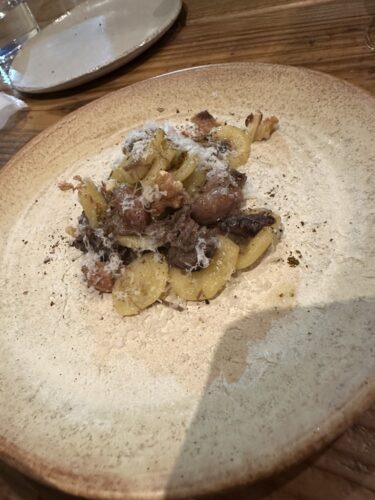 耳たぶ型のパスタ、オレキエッテを鹿のラグーと黒七味、コンテチーズで仕上げてくださいました。鹿のラグーとチーズがほんと素晴らしい!ワインがすすんじゃいます!