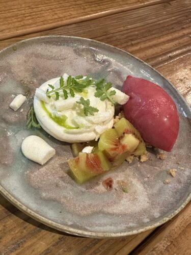 続いて登場したお料理がこれまた色合いが素晴らしい!なんだろうと思っていると、なんと馬肉のタルタル!アイオリソースに発酵玄米のおこげが添えてありました。これまた美味しい~!おこげの食感との相性が抜群!ほんとめちゃ美味しい~!