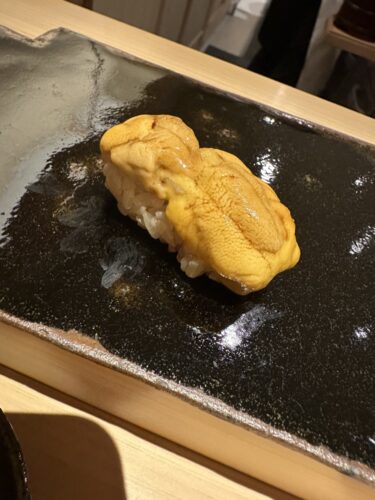 たっぷりの赤ウニをのせて登場しました!こぼれないように注意しながら一口で!言葉がでませんね~!なかなか予約が取れないからしっかり味合わないと!
