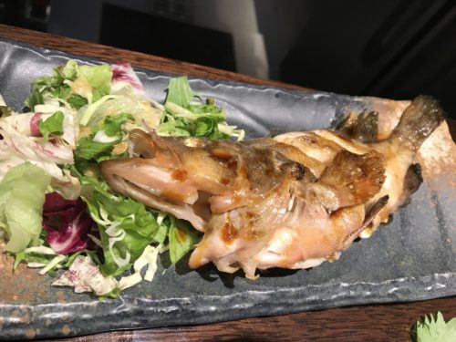 ここでしんごちゃんからあこうを出していただきました!しかも一尾まるごと!なんということですか~!こちらがお祝いしないといけないのに~!といいつつ、おいしさに負けてあっという間に平らげちゃいました!あ~おいしい~!お魚を一尾丸ごと鉄板で焼いていただくとこういうおいしさになるんだと発見になりました!