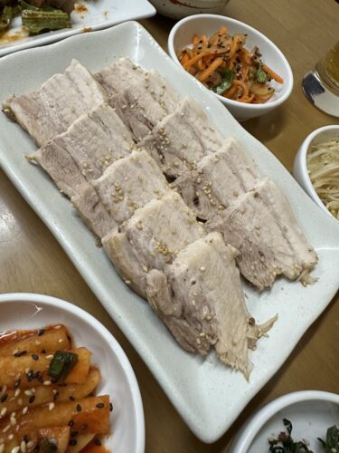 続いて蒸し豚が登場しました!厚切りの蒸し豚をキムチと一緒にいただきます。