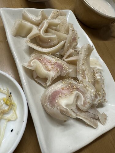 じゃあ豚耳をお願いします~!豚耳をチョジャンにつけていただくと、これがまた美味しい~!最高!