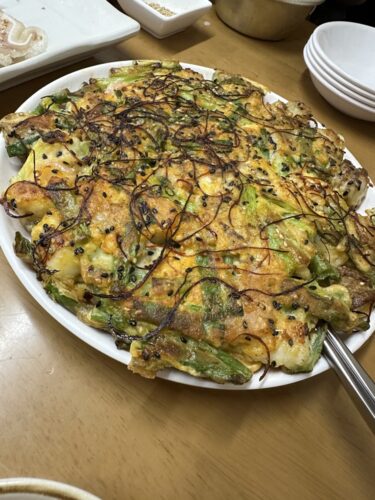 チヂミもいっとかないと!海鮮チヂミをお願いしました!海鮮がたっぷり入った海鮮チヂミ!ふわっとしてめちゃ美味しい~!