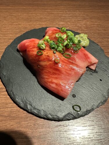 最初にとろ握り鮨が!いただいてみると、やばい、、、ぶちうまい!びっくりです!牛肉が口の中でとろけていきました!