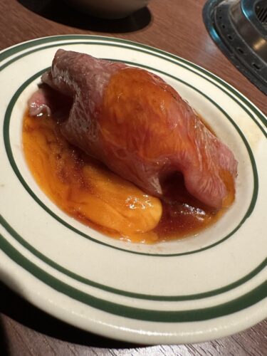 と思ったら焼いたお肉でごはんを巻いて、、お鮨みたいに!さらに卵の黄身を上からかけてくれて!いただいてみるとこれが抜群すぎる~!やばい、、何個でも食べれちゃいそう!