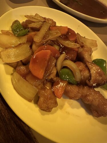 そこに待望の酢豚が登場しました!私は酢豚が大好物なんですよね~!豚肉たっぷりでめちゃくちゃありがたい~!いただいてみるとこりゃ美味しい~!玉ねぎのシャキ感が残してあるのもいいですね~!