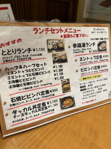 テーブル席に案内されてメニューをみてみるとランチセットメニューが豊富ですね!あ~冷麺も食べたいし、スンドゥブも食べたい!ビビンバも食べた~い!(笑)