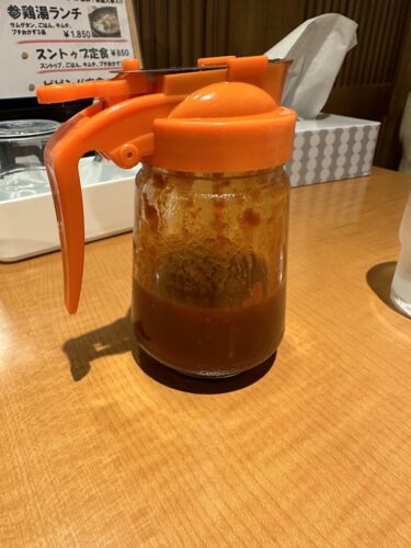 テーブルの上にコチュジャンが!お好み焼き屋さんにお好みソースが置いてあるのと同じ感じで!