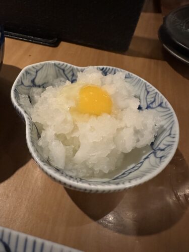 乾杯してまずは大根おろしからいただきます。ウズラの黄身と混ぜていただきます!